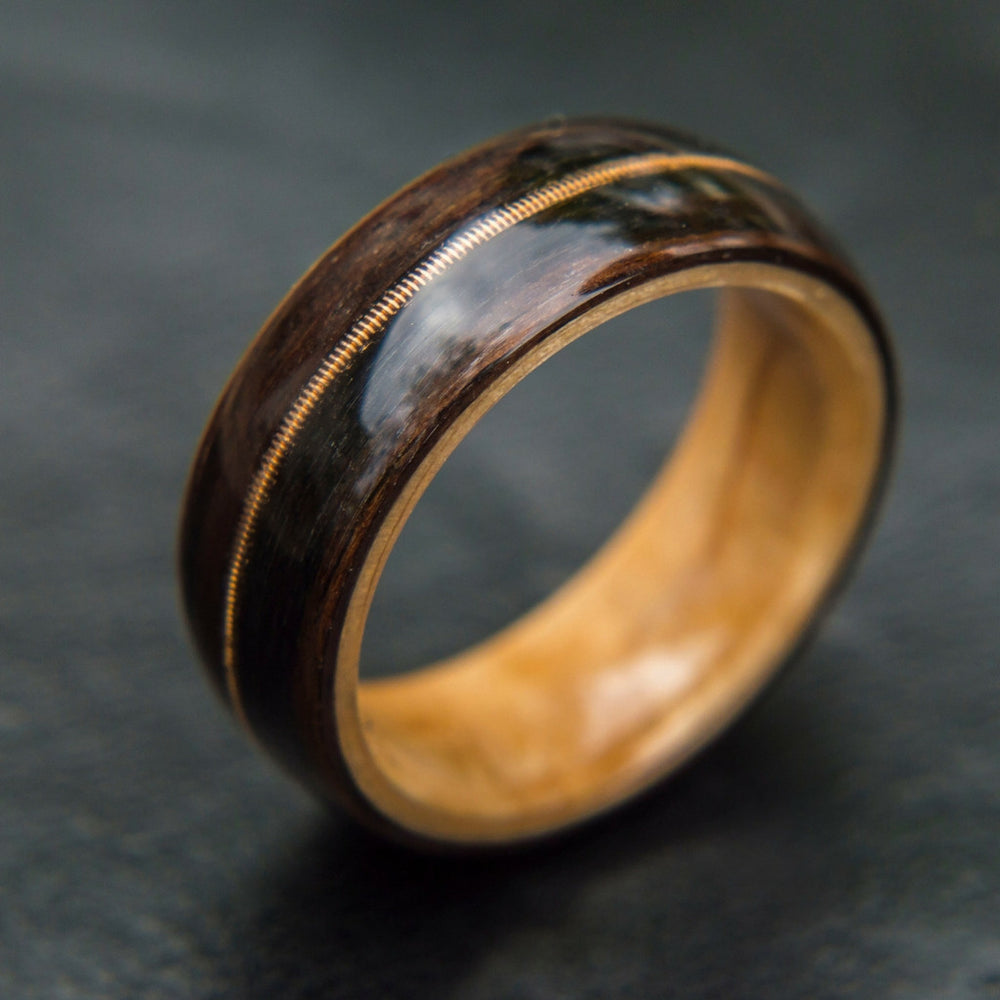 Inside, we've added a touch of ebony through a special bentwood technique. But the real star is the inlaid guitar string that wraps around the ring's surface. 🎶