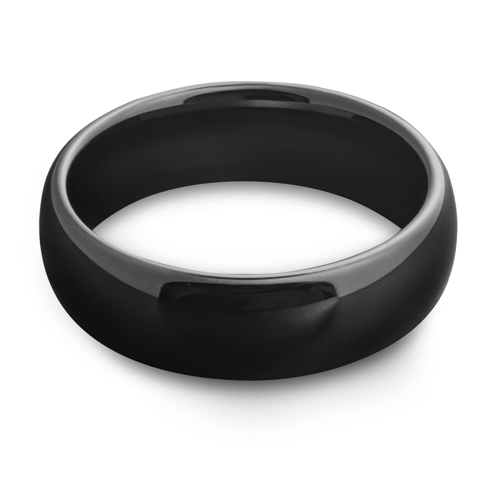 The Midnight Maverick is a bold take on a modern wedding band. Crafted from ultra-durable tungsten carbide, this 7mm black ring features a high-polish finish for a sleek, refined look. Its comfort-fit design makes it easy to wear all day, whether you're in a suit or work boots. Clean, strong, and timeless—built for a man who knows what he wants.