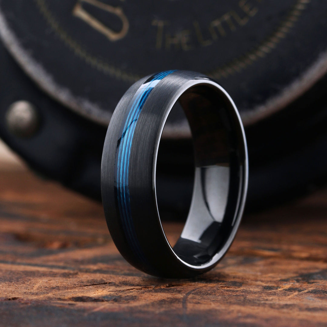 Get hooked with the ultimate wedding band for avid anglers - named after one of the world's best freshwater fishing lakes. Crafted with precision and care, this band features a sleek black tungsten carbide base with a striking blue fishing line inlay. The black brushed texture on the top adds a rugged, masculine look that's sure to make a statement, while the high-polish interior guarantees maximum comfort for long hours of wear. After all, who wants to be bothered by discomfort while they're reeling in the catch of the day?