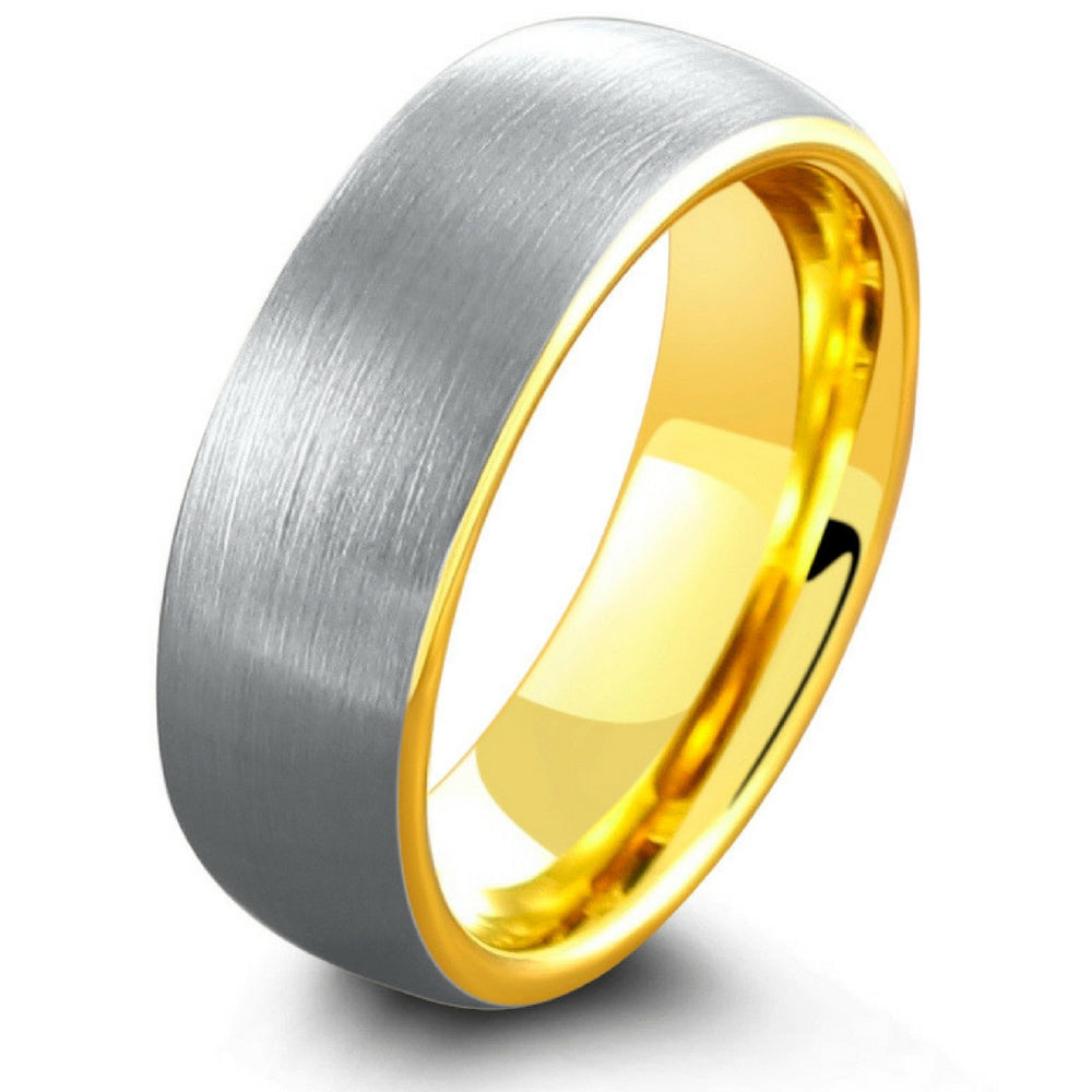 This men's tungsten wedding band features a brushed silver-colored exterior and a yellow-gold polished finish interior. The dome shape ensures exceptional comfort. Crafted from high-grade tungsten carbide, this ring is extremely durable for everyday wear.